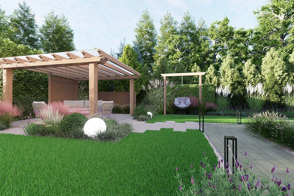z pergolą. Projekt zakłada utworzenie również ogrodzenia terenu z każdej ze stron. Przy wejściu do ogrodu od strony frontowej planuję się nasadzenia z roślin zimozielonych. Do dalszej części ogrodu, dojście stanowi nawierzchnia z płyt betonowych o regularnych wymiarach. Na terenie zaprojektowano nasadzenia w wydzielonych rabatach o geometrycznym kształcie, głównie roślin trawiastych oraz krzewów liściastych oraz drzew formowanych. Na działce planuję się wykonanie miejsca na palenisko ogrodowe.