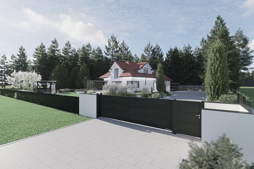 z furtką oraz jedną bramą wjazdową. W obniżonej części terenu planuję się posadowienie dużego miejsca odpoczynku w postaci placu z płyt, umożliwiającego ustawienie pergoli ogrodowej z kuchnią letnią. Dalej przejście z płyt prowadzi nas do tarasu z jacuzzi.