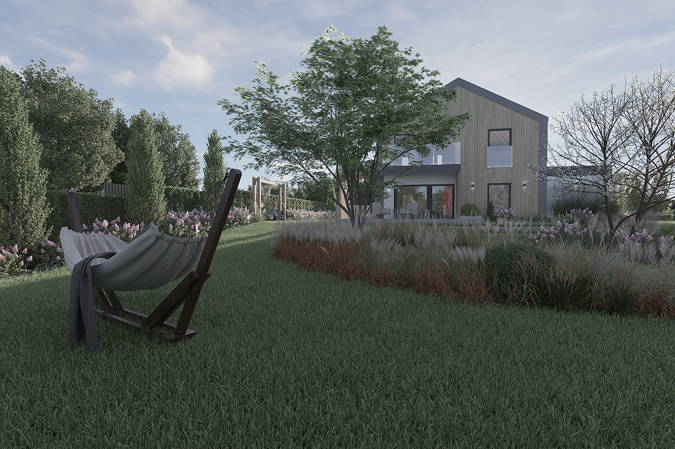 z nowym zadaszeniem i lamelami po obu stronach. W dalszej części terenu znajdziemy ścieżkę z płyt betonowych ze schodami terenowymi oraz rabaty z roślinnością zimozieloną i trawiastą. Po stronie wschodniej projektuję się miejsce na pergolę z huśtawkami. Dalej ścieżka prowadzi nas do miejsca rekreacji z miejscami do siedzenia oraz pergolą ogrodową. Za tą strefą znajdziemy nasadzenia żywopłotowe. W południowej części działki znajdziemy strefę użytkową do uprawy warzyw w skrzyniach i wielu krzewów owocowych. Strefę tą oddziela od strefy rekreacyjnej drewniany płotek.